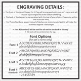 The front of this custom dog or cat tag can be personalized with your pet's name and 1 paw print at the bottom. The back of the tag can be personalized with your contact information. A font can be selected for the name on the front of the tag. All other text on the tag will be engraved with Optima font and will be sized and centered to fit on the tag.
