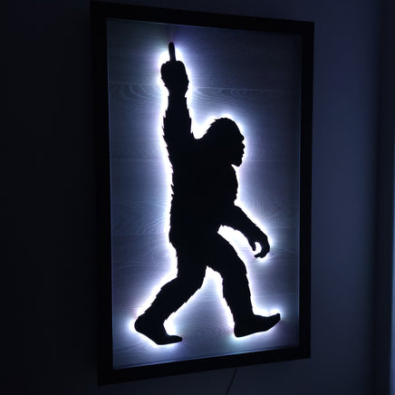 Framed Wooden Bigfoot with Middle Finger Sign set aglow with LED lights.