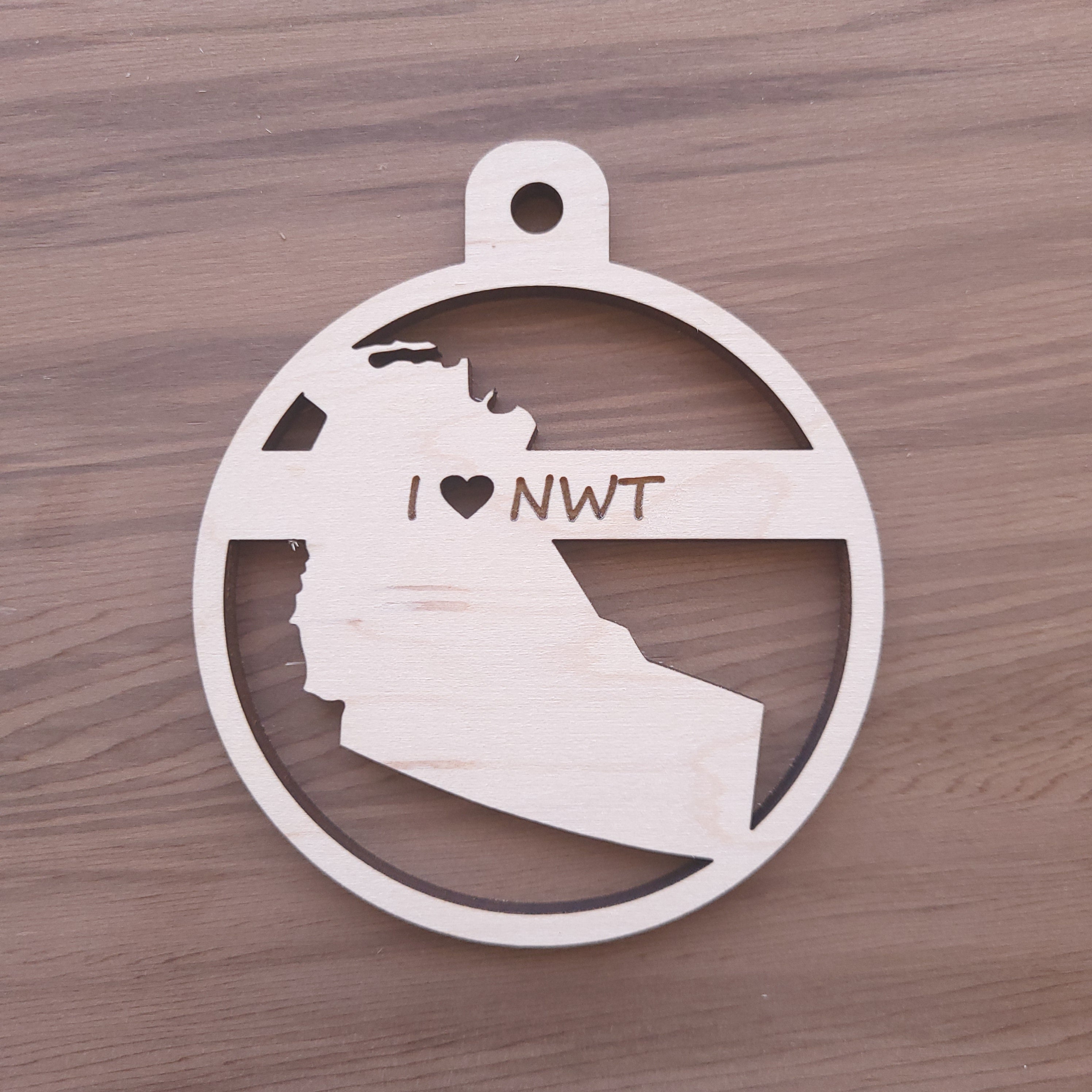 Details: Wooden Northwest Territories ornament. Laser engraved. Includes 8" twine string for hanging.